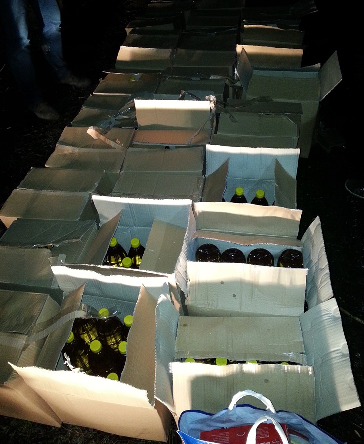 При подобен случай в района на Гурково митническа мобилна група установява, че в търговски обект се продава високоградусов алкохол без документи за платен акциз, разлят в половинлитрови пластмасови бутилки. В частен имот в близост митническите служители намират 189 л ракия, разфасована в туби по 10 л.